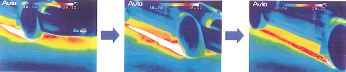 La capacidad de medición en tiempo real de las cámaras termográficas NEC se aplica para medir la temperatura de los neumáticos y los frenos en alta velocidad. Las fotos siguientes muestran el proceso de temperatura de transición instantánea de la superficie de la carretera, como resultado de la fricción entre el neumático y la carretera respecto del frenado para detener el vehºCulo.