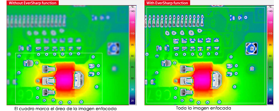 Las cámaras termográficas por su sistema óptico tienen un plano focal muy corto, esto significa que cuando se enfoca un objeto y aparece de forma nítida en pantalla, el resto de los objetos más próximos o más distantes al plano de enfoque, aparecen de forma difuminada. VarioCam ha patentado su sistema EverSharp ® que permite no solo observar con nitidez el objeto enfocado sino todos los que aparecen en pantalla. Cuando la cámara captura un termograma hace un barrido de todas las distancias focales y compone una imagen resultante totalmente radiométrica con la suma de todos estos planos, dando como resultado una imagen nítida de toda la pantalla, evitando así realizar varios termogramas de objetos diferentes